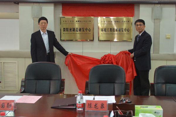 揭牌仪式前,景国勋校长首先致辞。他对台湾昆山科技大学客人的到来表示热烈欢迎,回顾了两校合作交流历程,希望双方以共建研发中心为平台,联合开展科技攻关、人才培养和协同创新,实现优势互补,推动两校合作持续健康快速发展。他表示,安阳工学院将全力支持研发中心的建设,为中心提供开展研究工作所必须的支撑条件。陈龙泉处长代表该校校长苏炎坤,对两校共建研发中心揭牌仪式的成功举行表示祝贺,简要介绍了昆山科技大学在微精密制造和环境工程领域的特色和优势,希望通过共建研发中心,解决机械制造和环境工程中的关键问题,以更密切的合作精神和优异的研究成果,为两岸高校之间的合作交流做出示范。